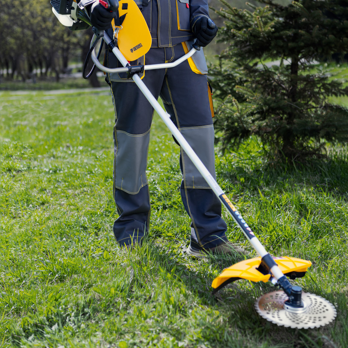 - Дополнительные возможности — можно приобрести и установить на триммер диск Denzel 96323 для быстрого удаления растительности с жесткими стеблями, 96328 для скашивания молодых побегов кустарника диаметром до 3 мм.