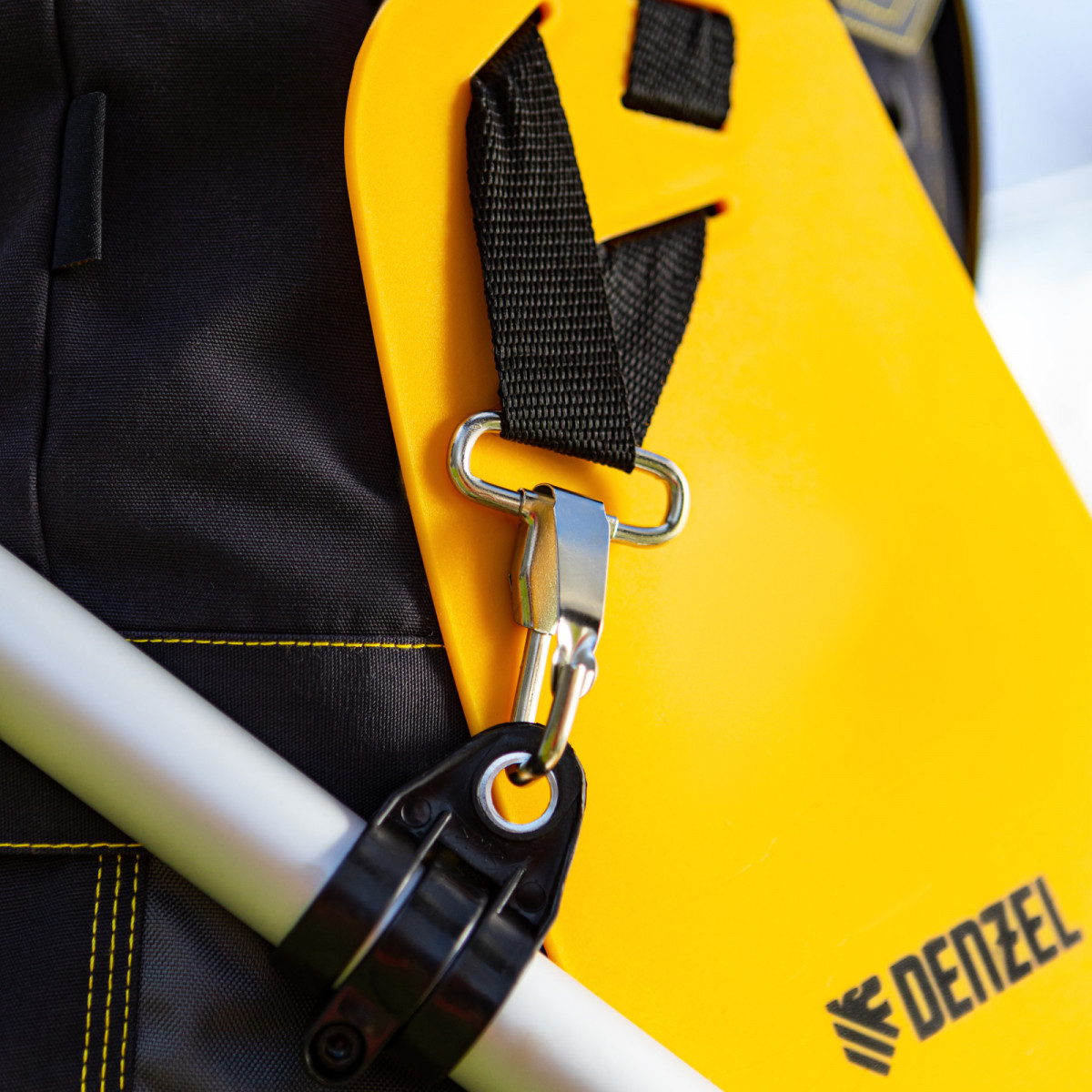 - Дополнительные возможности — можно приобрести и установить на триммер диск Denzel 96323 для быстрого удаления растительности с жесткими стеблями, 96328 для скашивания молодых побегов кустарника диаметром до 3 мм