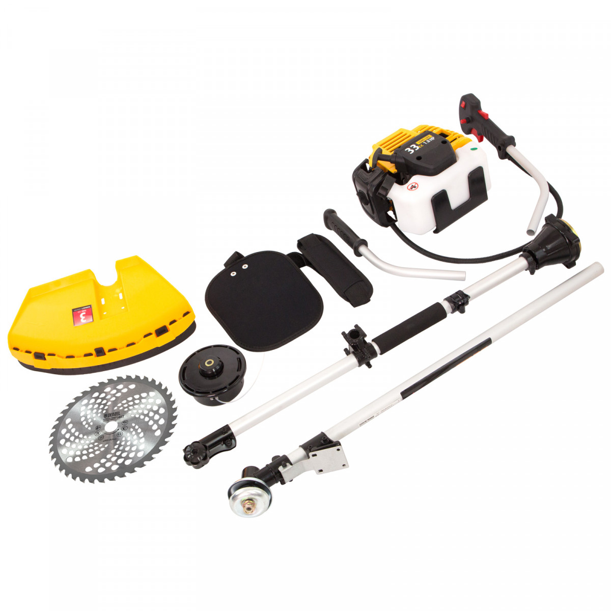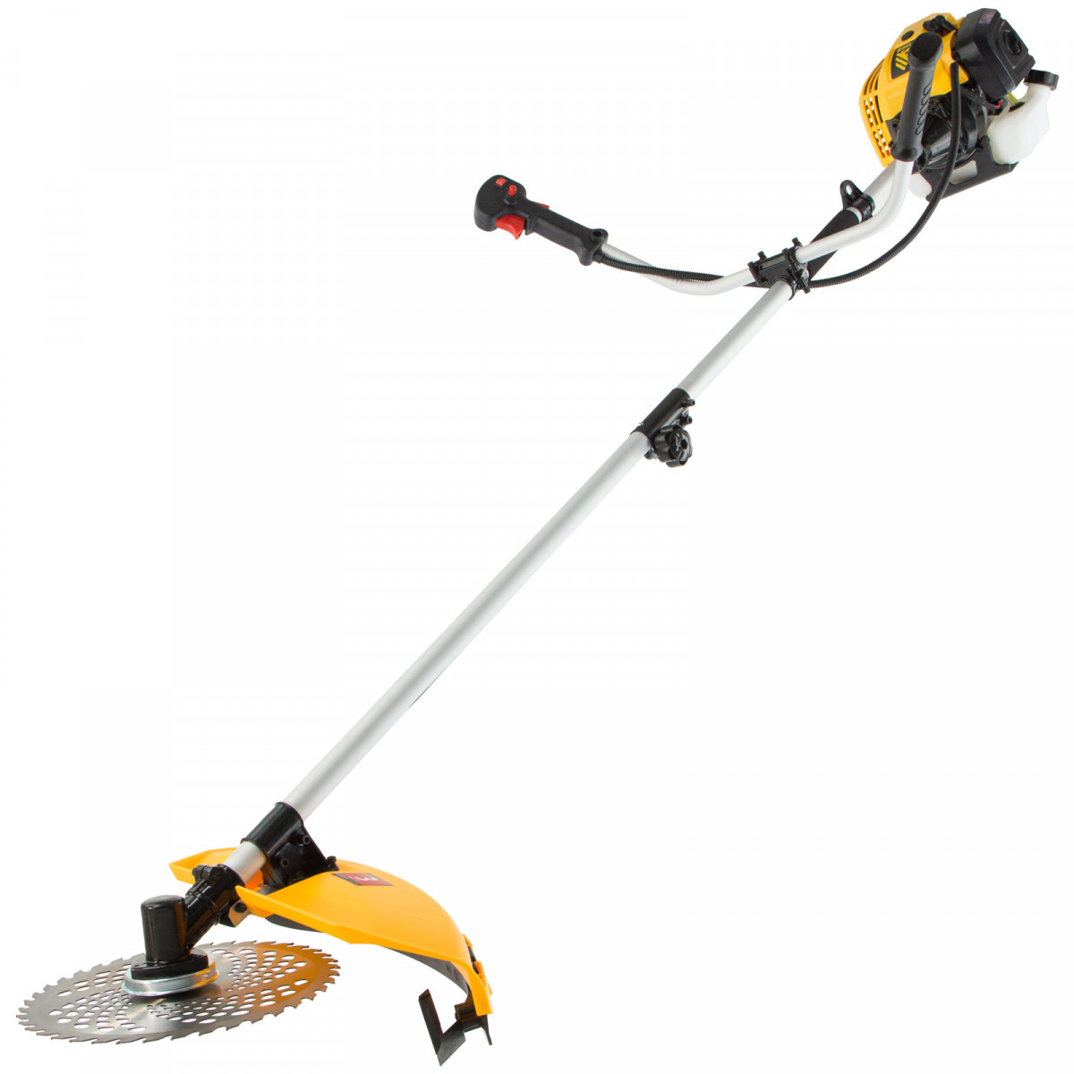 Бензиновый триммер Denzel DT-33S 96223 с двигателем мощностью 1,8 л.с. и объемом 33 см3, с разъемной штангой, поставляется комплектом из 2 частей и предназначен для подравнивания газона и скашивания травы всех типов, в том числе с жесткими древовидными стеблями (полыни, крапивы, лебеды, борщевика), а также срезания кустарника и молодых побегов деревьев с диаметром стволов до 10 мм. Удобен для работы в труднодоступных местах, может работать с мокрой травой. Режущими элементами являются катушка с леской и пильный диск, ширина скашивания составляет 420 мм и 255 мм соответственно.,Испытания подтвердили, что триммер способен работать до отказа 80 часов подряд.