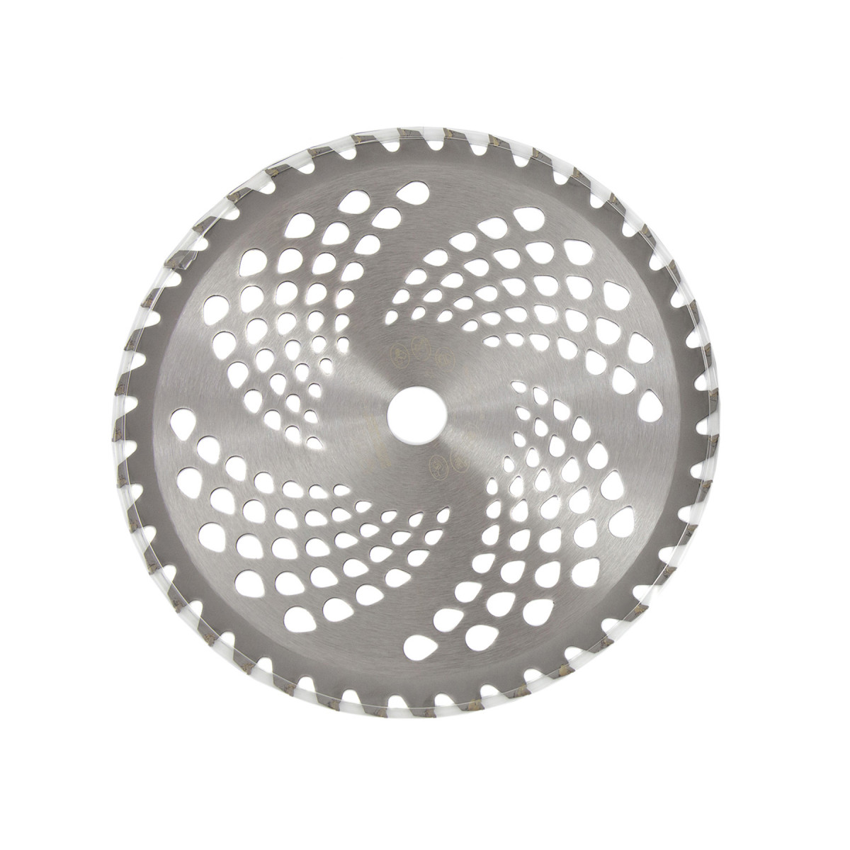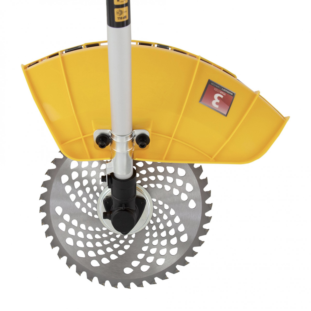 - Дополнительные возможности — можно приобрести диски Denzel 96323, 96325 для быстрого удаления растительности с жесткими стеблями, 96328 для скашивания молодых побегов кустарника диаметром до 3 мм.