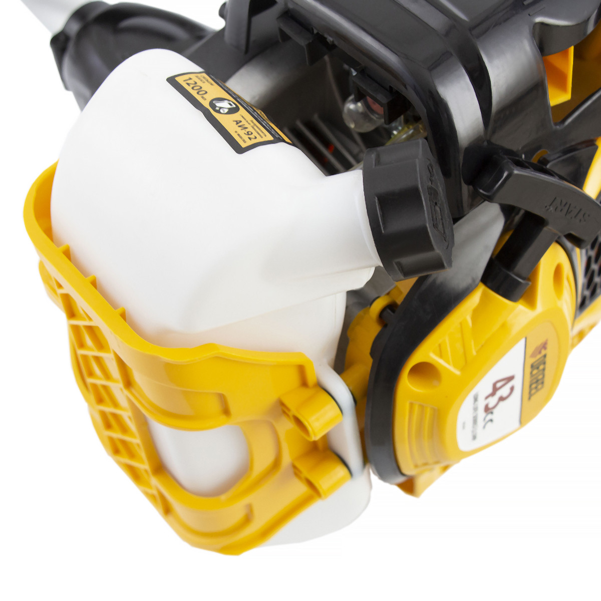 • Безопасность — клавиша блокировки газа предотвращает случайный запуск двигателя, прочный кожух исключает вылетание травы, веток и камней на пользователя.