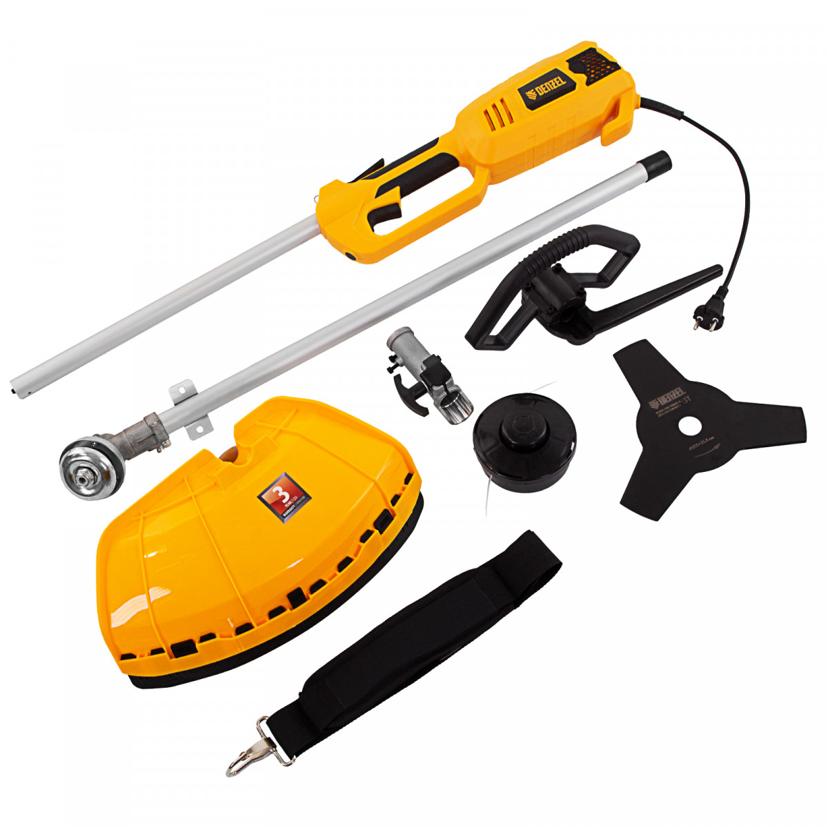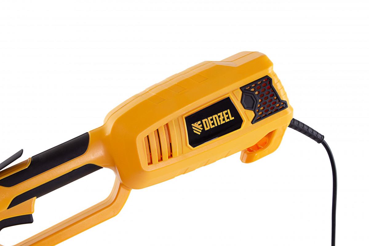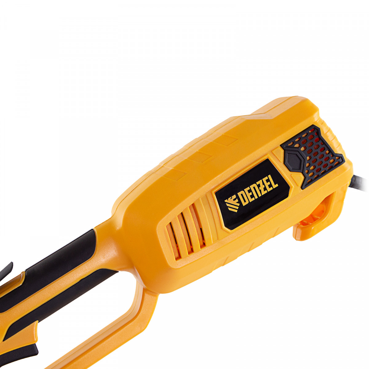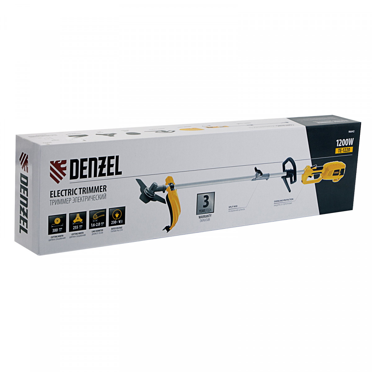 Электрический триммер Denzel TE-1220 96642 мощностью 1200 Вт, с разборной штангой, катушкой и диском, предназначен для скашивания травы различных типов, в том числе с жесткими стеблями: полыни, крапивы, лебеды. Мощный двигатель обеспечивает вращение катушки и диска со скоростью 7500 об/мин. Ширина скашивания за один проход составляет 38 см при использовании лески и 25,5 при использовании диска, что удобно для работы на небольших участках. Электродвигатель не требует приготовления топливной смеси и сложного технического обслуживания. Благодаря отсутствию вредных выбросов и неприятного запаха работа триммера не вредит здоровью и не вызывает дискомфорт.,Дополнительно к триммеру можно приобрести диск Denzel 96323 с шириной скашивания 230 мм для быстрого удаления растительности с жесткими стеблями, 96328 для скашивания молодых побегов кустарника диаметром до 3 мм, 96340 для срезания борщевика, кустарника и молодых побегов деревьев с диаметром стволов до 10 мм.