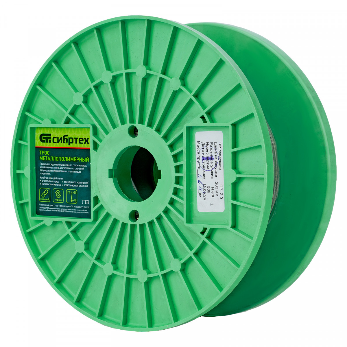 Металлополимерный прозрачный трос ПР-2.0 Сибртех 47624 толщиной 2,0 мм, 200 м. п. на катушке, используется для монтажа рекламных баннеров, установки ограждений, палаток, теплиц, погружения скважинных насосов и датчиков. Применяется в качестве садового троса-шнура для подвязки растений, а также может служить для развешивания белья. Жила шнура изготовлена из стальной проволоки, поэтому он выдерживает значительные нагрузки.