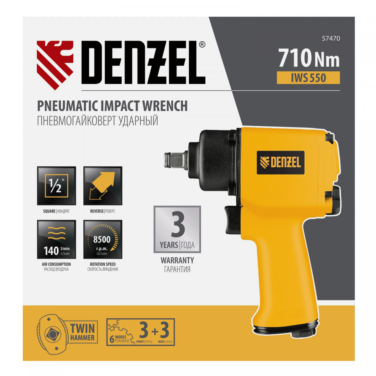Ударный пневмогайковерт Denzel IWS550 Compact 57470 с присоединительным квадратом 1/2″ обеспечивает скорость вращения шпинделя 8500 об/мин и максимальный крутящий момент 550 Нм. Используется для закручивания и выкручивания резьбового крепежа. Благодаря встроенному механизму Twin Hammer инструмент справляется даже с проржавевшими соединениями. Пневмогайковерт применяется для решения профессиональных задач в цехах, на строительных площадках и в автосервисах.