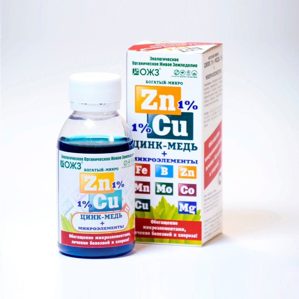 Богатый - микро ZnCu (цинк 1% + медь 1% + микроэлементы) - 0,1л., жидкость. Состав: Zn-1%, Cu-1%, Mn-0,018%, Fe-0,02%, Co-0,0008%, B-0,0014%, Mo-0,004%, Mg-0,0025% в хелатной форме. Назначение: обогащение микроэлементами, профилактика и лечение болезней и хлороза, вызванного дефицитом цинка и меди у плодовоягодных, овощных, декоративных, полевых культур и винограда. Для профилактики - обработка 1 раз в 2 недели. Для лечения - до полного исчезновения признаков болезни. Способ применения - опрыскивание растений в период