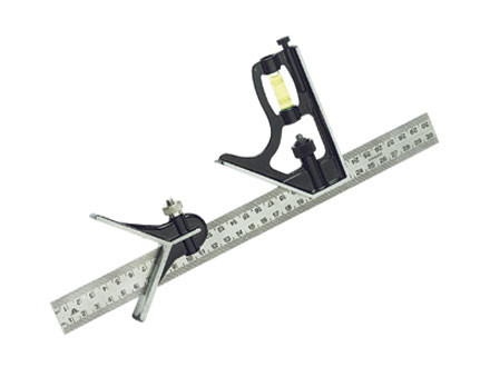 Полотно угольника имеет двухстороннюю разметку. Комбинированная конструкция позволяет проводить измерения разных углов. Оснащен пузырьковым уровнем.