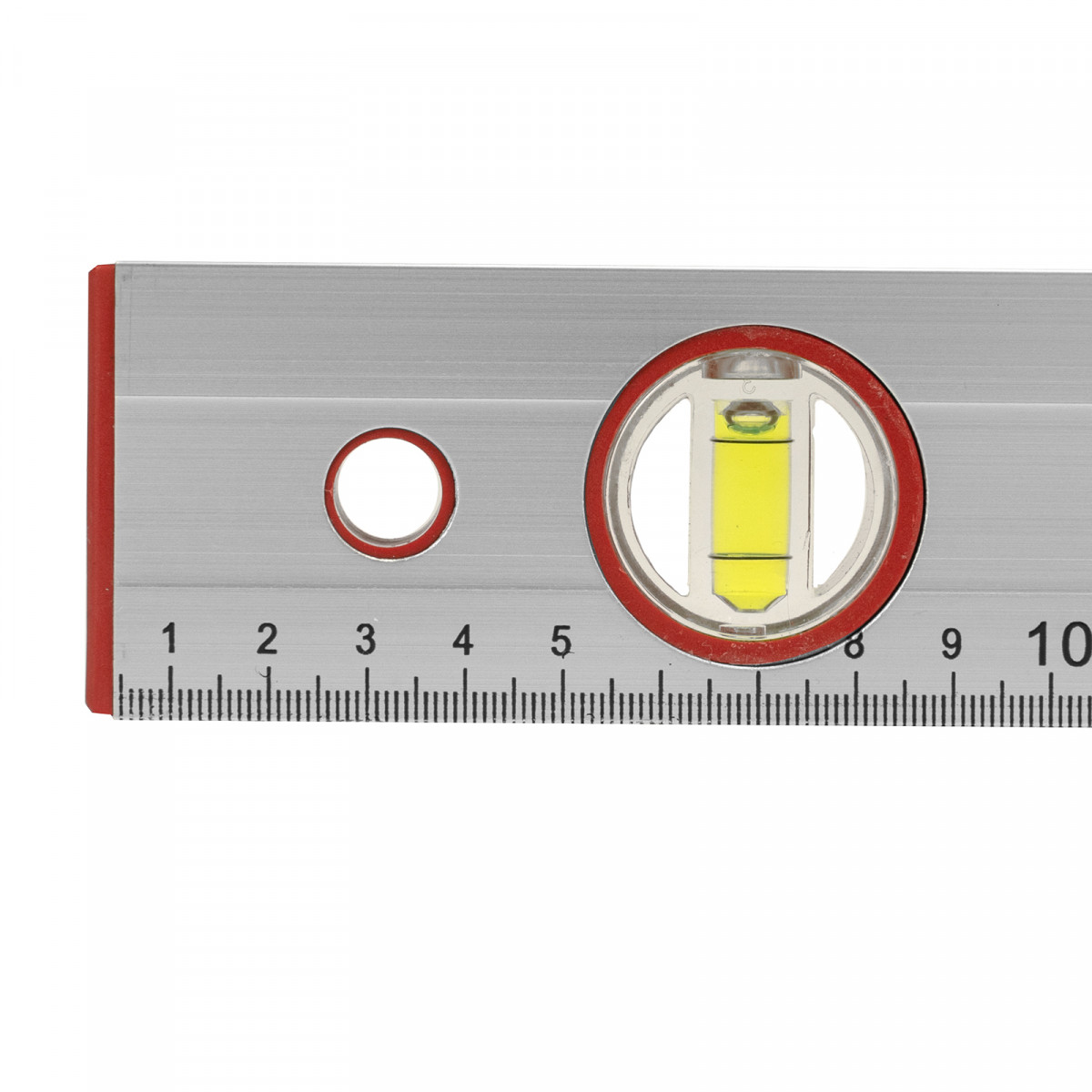 Алюминиевый уровень Sparta 35110 длиной 1000 мм, с 2 глазками и линейкой, рассчитан на применение в быту и в производственных условиях. Он поможет добиться точного выстраивания разметочных линий для последующей установки конструкций, полок, укладки облицовочных материалов и т.д. Две пузырьковые ампулы обеспечивают точный контроль отклонений поверхностей от горизонтальной и вертикальной плоскостей.,Для определения отклонения вертикали 90 градусов необходимо использовать пузырьковую ампулу только в верхнем положении уровня. Только базовая поверхность является рабочей (противоположная ампуле 180 градусов).