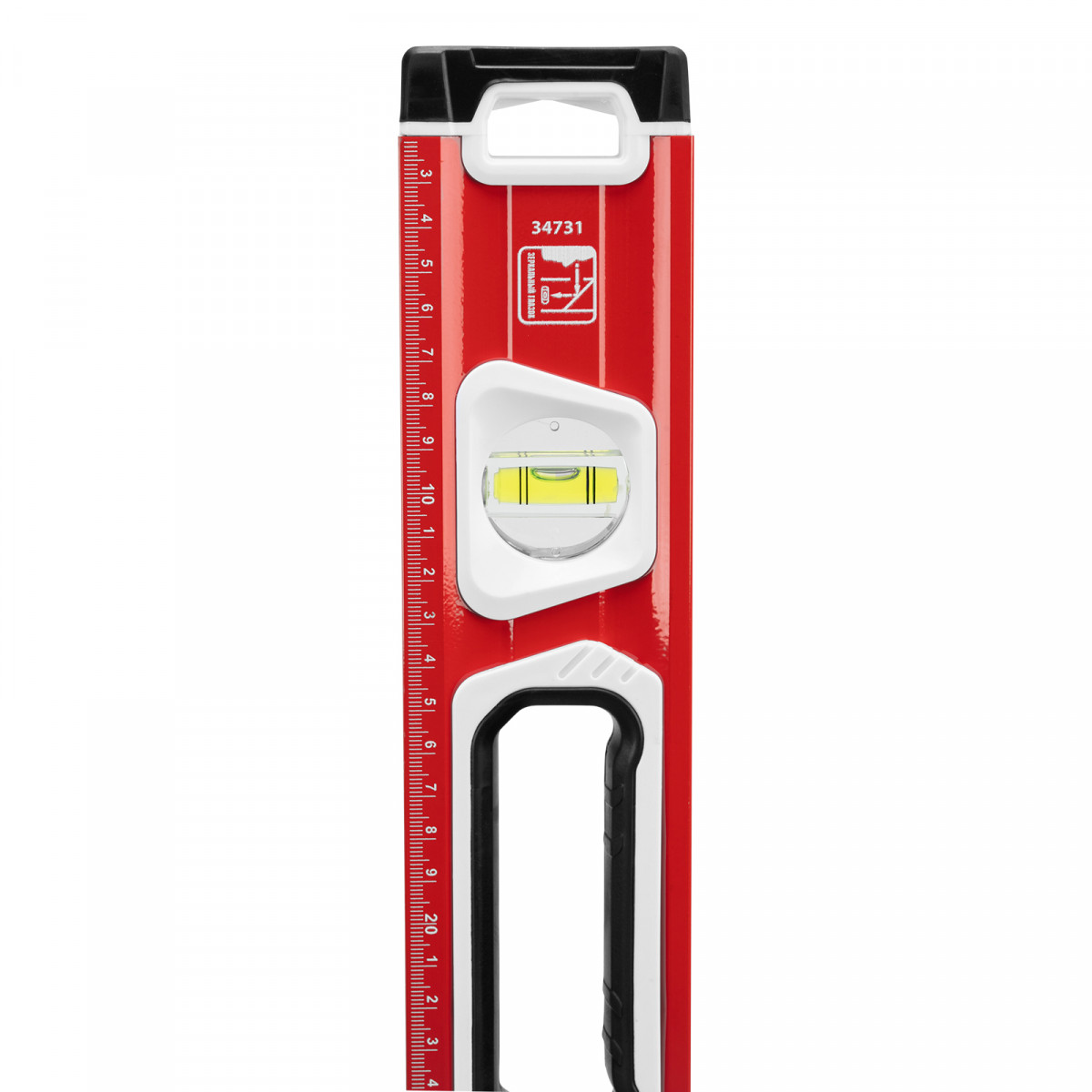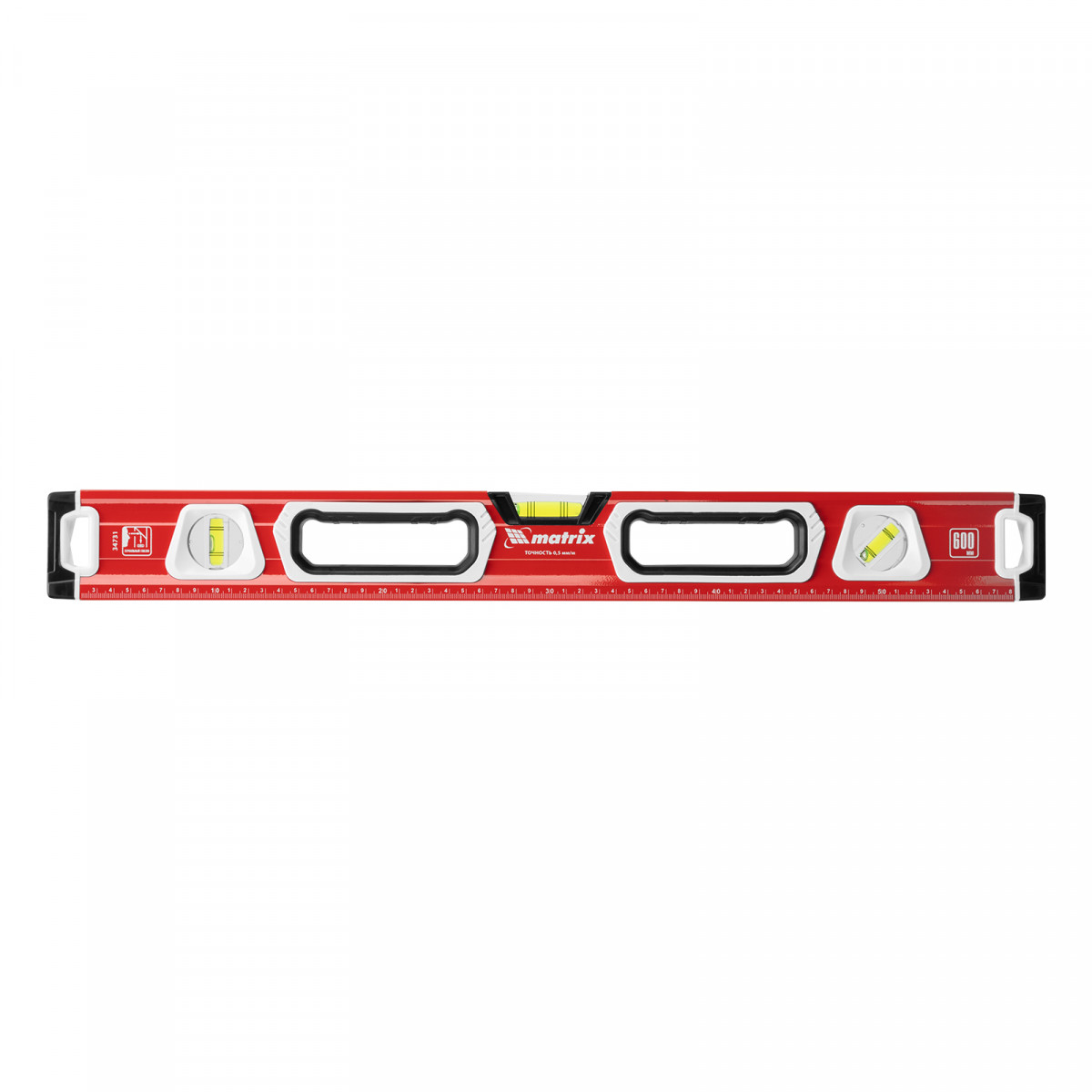 Алюминиевый уровень Matrix 34731 длиной 600 мм, магнитный, фрезерованный, с двухкомпонентными рукоятками, 3 глазками и 1 зеркальным отражателем, относится к категории измерительных инструментов. Служит для контроля отклонений поверхностей от горизонтали, вертикали и угла 45 градусов. Инструмент понадобится при осуществлении работ, требующих высокой точности.,Для определения отклонения вертикали 90 градусов необходимо использовать пузырьковую ампулу только в верхнем положении уровня. Только базовая поверхность является рабочей (противоположная ампуле 180 градусов).