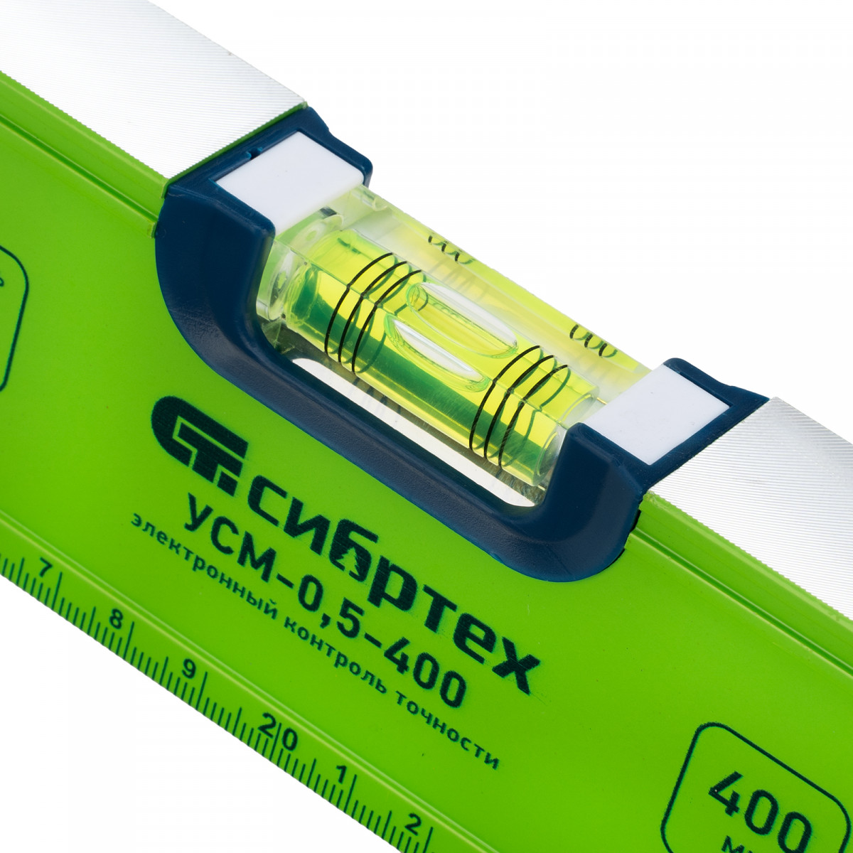 Алюминиевый фрезерованный уровень Сибртех УСМ-0,5-400 34113 длиной 400 мм, магнитный, с 3 глазками, поможет найти отклонения от горизонтальной и вертикальной плоскостей и угла 45 градусов. Инструмент незаменим при осуществлении строительных и ремонтных работ, т.к. обеспечивает высокую точность работы.,Для определения отклонения вертикали 90 градусов необходимо использовать пузырьковую ампулу только в верхнем положении уровня. Только базовая поверхность является рабочей (противоположная ампуле 180 градусов).