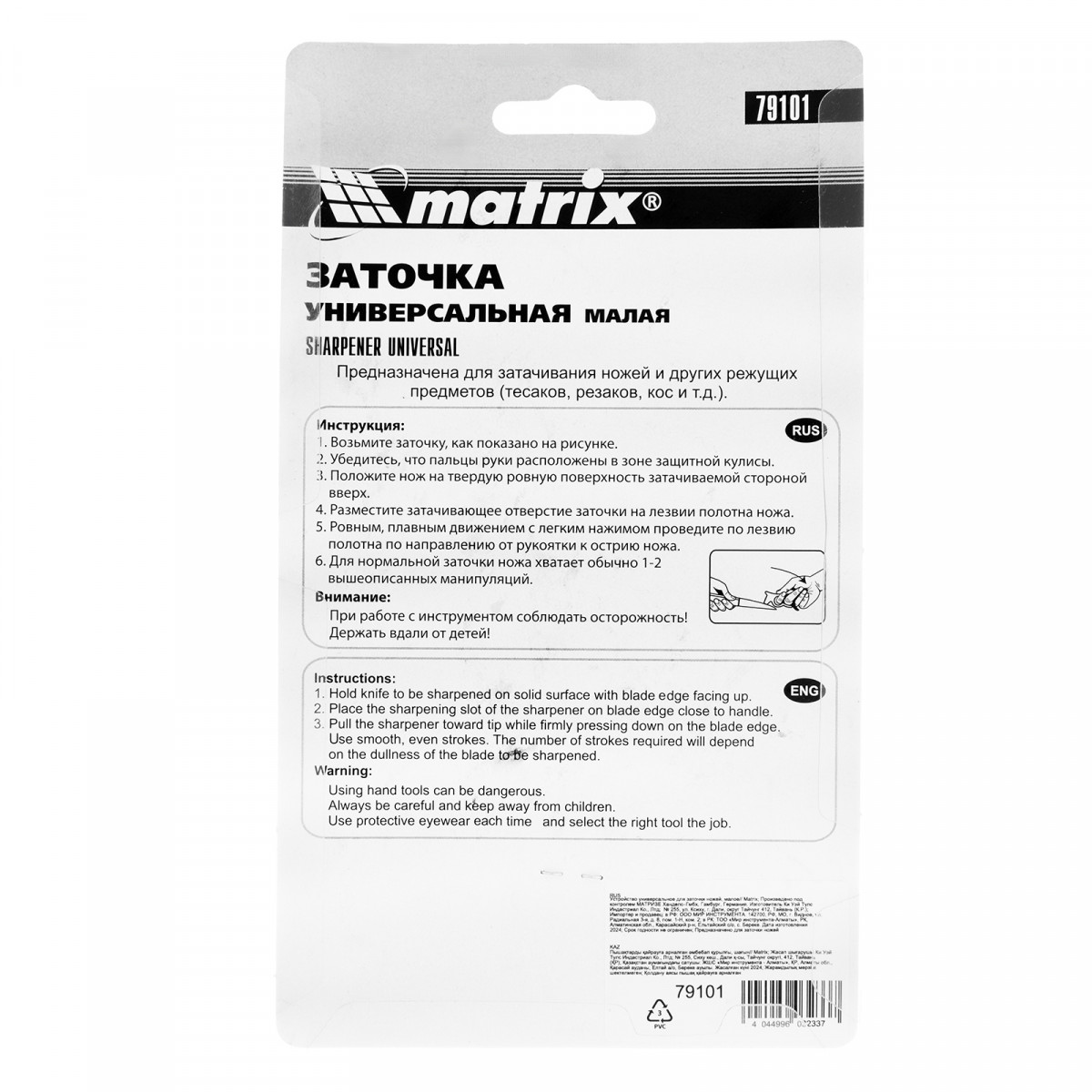 Универсальное устройство для заточки Matrix 79101, малое, служит для восстановления остроты ножей, а также кос, тесаков, резаков и других режущих инструментов. У точилки имеется защитная кулиса, поэтому она безопасна в эксплуатации. Устройством могут пользоваться как правши, так и левши. Способ применения прост — достаточно 1-2 раза провести точилкой по режущей кромке. Приспособление рекомендовано для использования в быту.