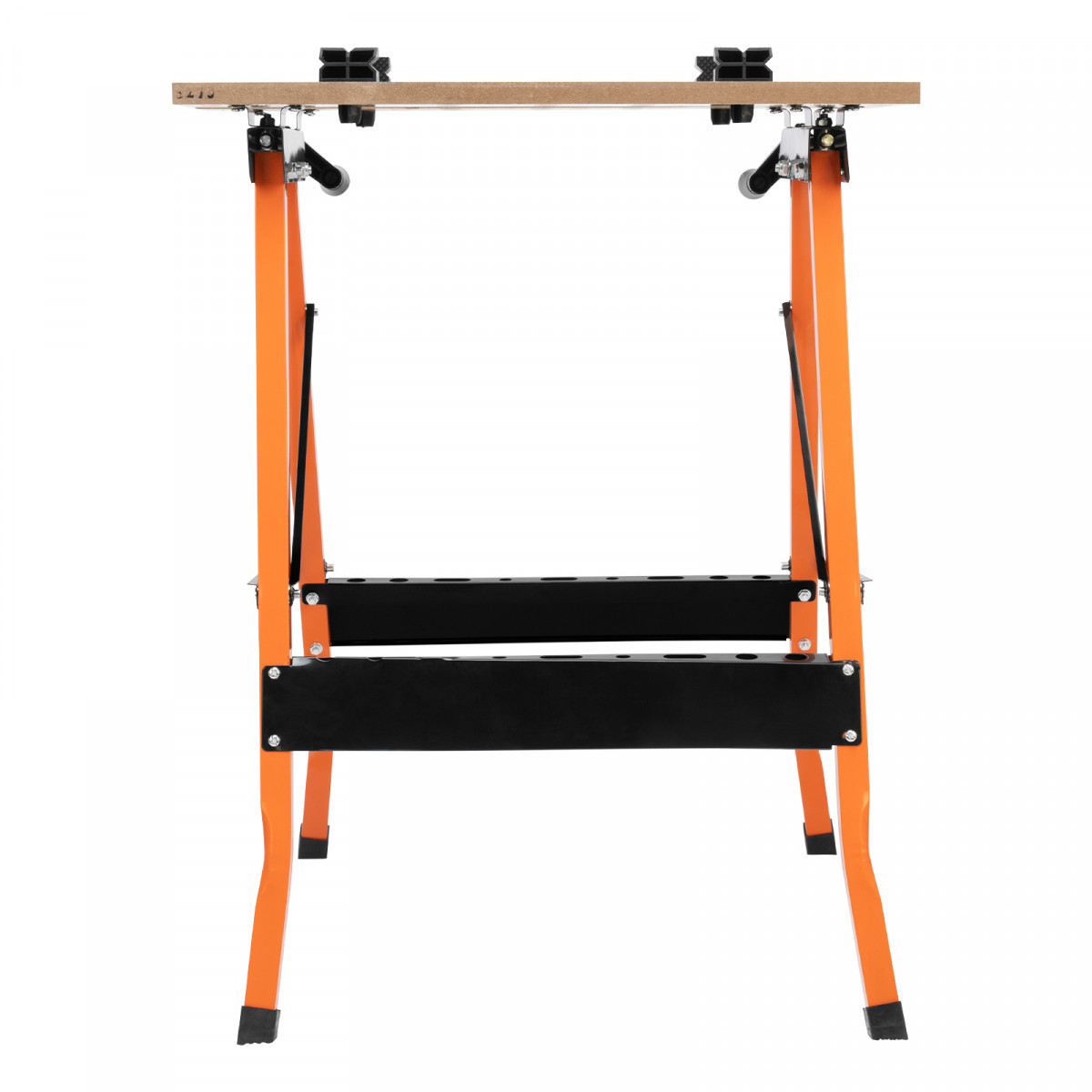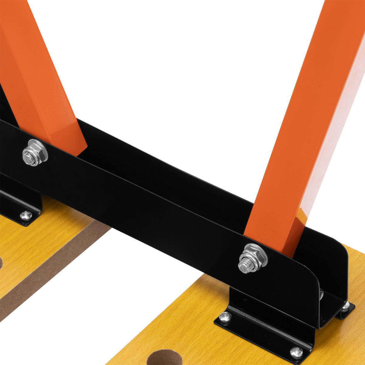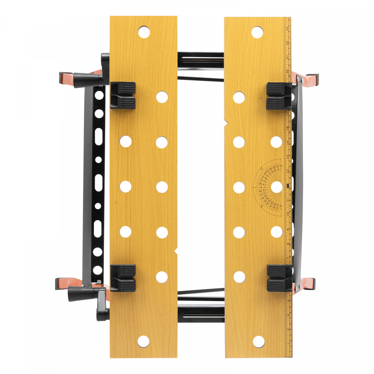 • Удобная эксплуатация — верстак снабжен 4 съемными упорами, которые устанавливаются в различных позициях, а на столешнице имеется разметка с линейкой и транспортиром.