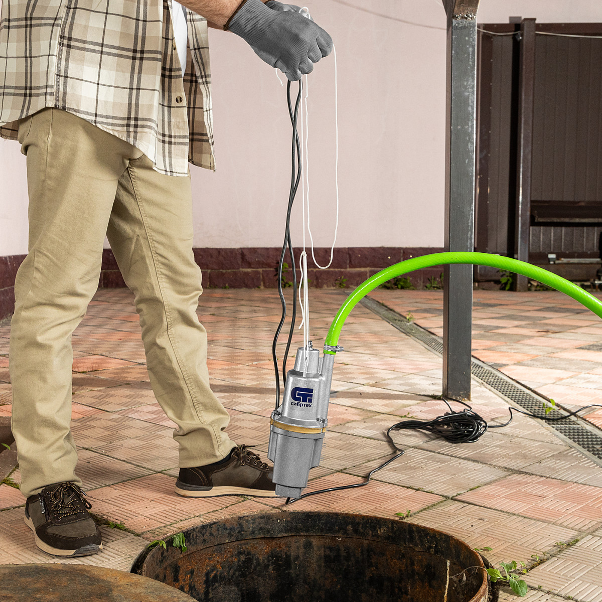 • Необходимые аксессуары в комплекте — трос для погружения и хомут для закрепления шланга прилагаются к насосу.