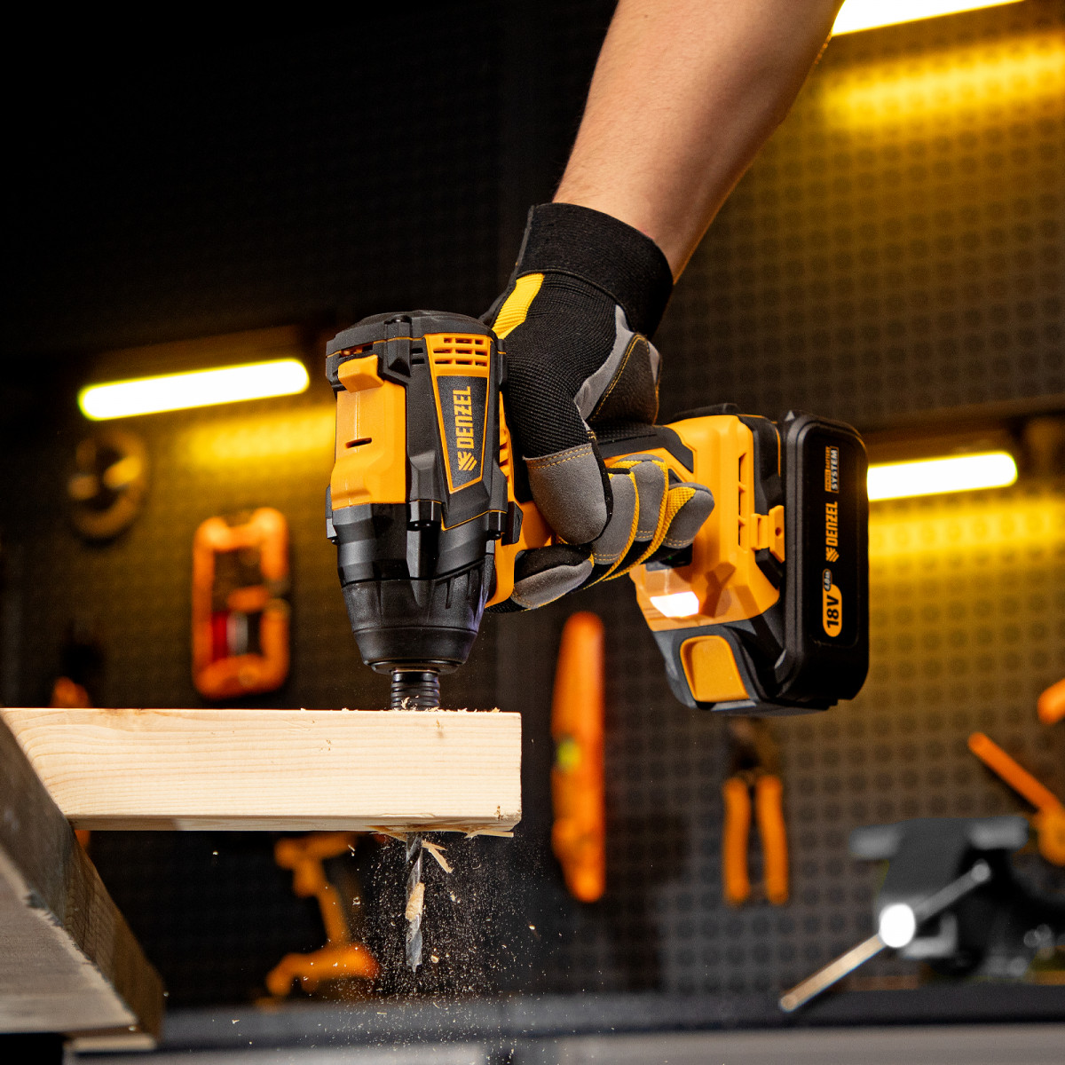 - Универсальность — к инструменту подойдут любые 18 В аккумуляторы Denzel battery system