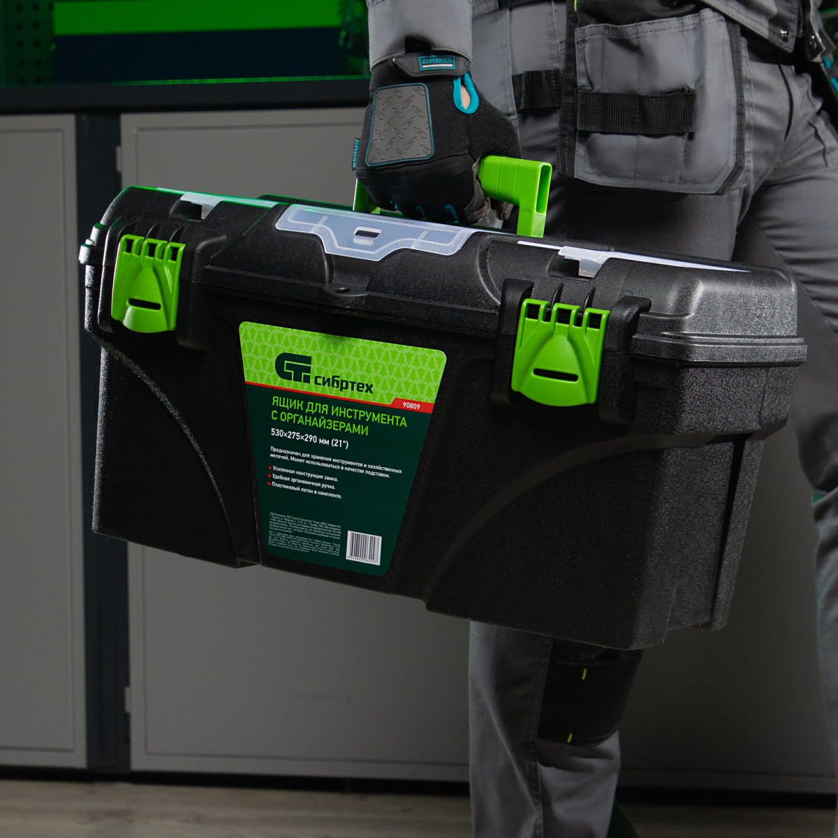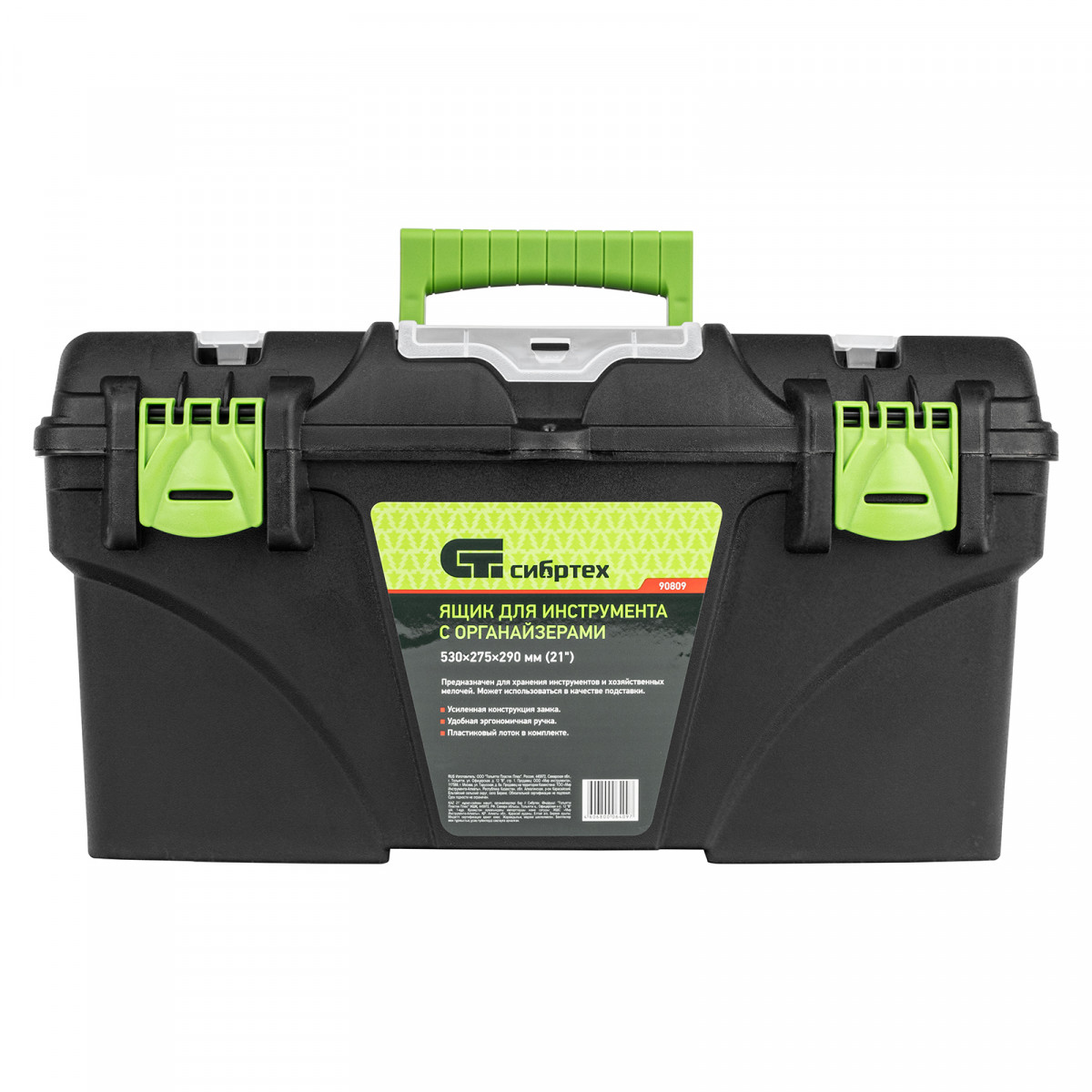 Ящик Сибртех 90809 длиной 21", с органайзерами, используется для хранения и транспортировки инструментов, оснастки, крепежа, хозяйственных мелочей и других предметов. Крышка и замок усилены трехрядными петлями, поэтому ящик выдерживает вес содержимого до 50 кг. Съемный лоток позволяет оптимизировать пространство внутри ящика. Его можно брать в поездку, также он пригодится дома, на даче или в гараже.