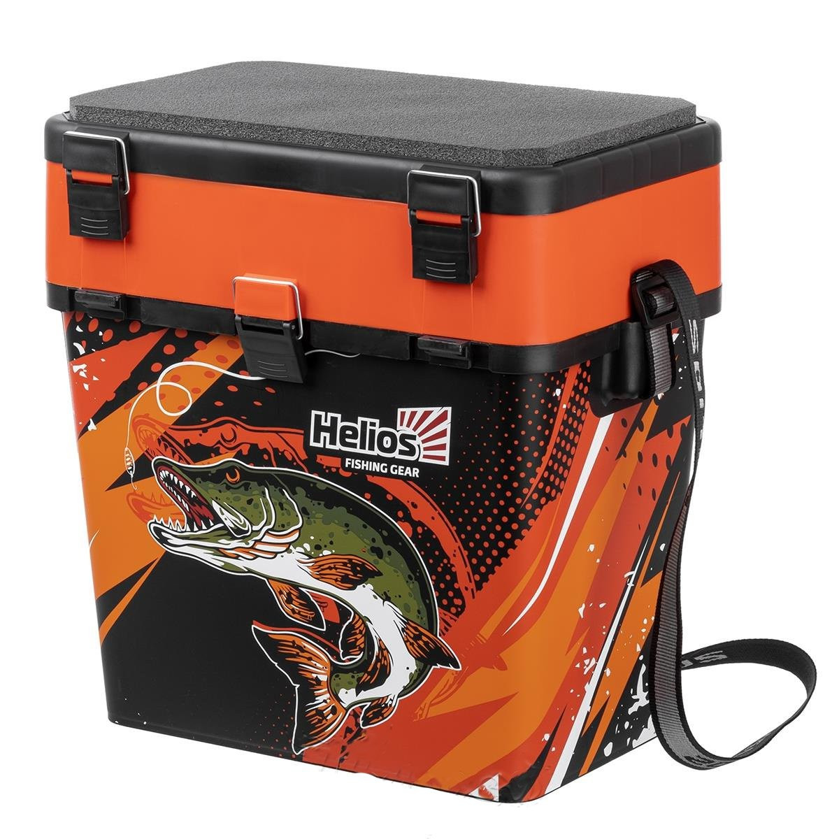 Ящик зимний рыболовный торговой марки Helios с индивидуальным дизайном с изображением щуки изготовлен из ударопрочного, морозостойкого и в то же время легкого пластика, обеспечивает надежное хранение и транспортировку рыболовных снастей.