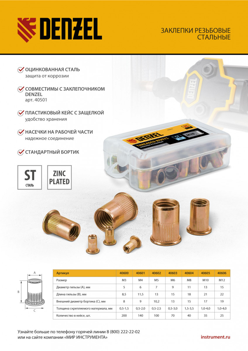 Стальные резьбовые заклепки Denzel 40601, с резьбой M4, оцинкованные, предназначены для скрепления листовых материалов толщиной 0,5-2 мм. Совместимы с заклепочником Denzel 40501. Позволяют получить резьбовое соединение даже при одностороннем доступе к месту крепления. Крепежные элементы используются для проведения строительных и монтажных работ, пригодятся на даче и в гараже.