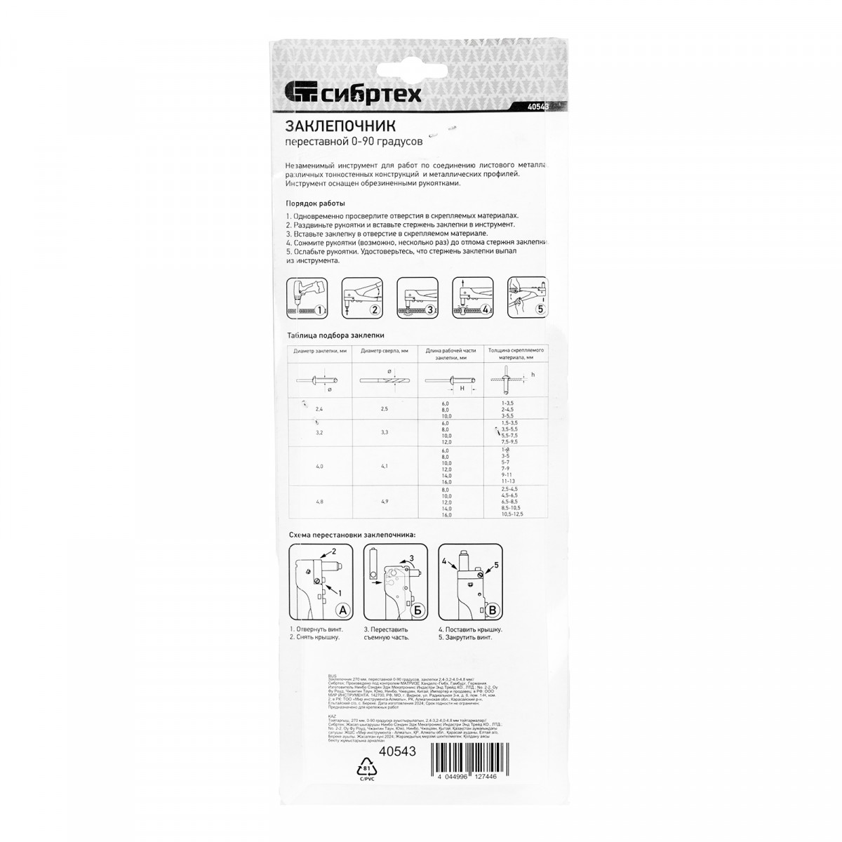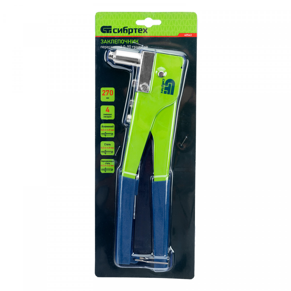 Заклепочник 270 мм, переставной 0-90 град, заклепки 2.4-3.2-4.0-4.8 мм Сибртех