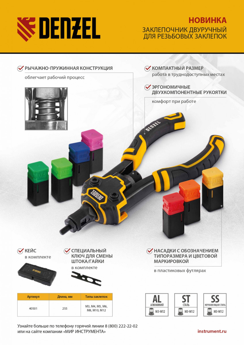 Заклепочник двуручный Denzel 40501 длиной 255 мм предназначен для создания неразъемных соединений при помощи резьбовых заклепок из алюминия, стали или нержавеющей стали (М3, М4, М5, М6, М8, М10, М12). Позволяет прочно фиксировать листовые заготовки, металлический профиль и легкие конструкции. Для каждого типоразмера заклепок предусмотрена соответствующая головка. Инструмент применяется при проведении строительных, монтажных работ, будет полезен дома, в гараже или на даче.