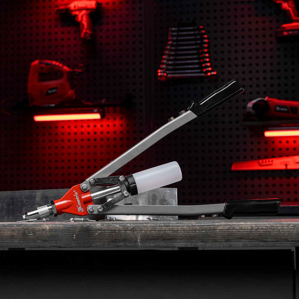 • Порядок на рабочем месте — заклепочник снабжен контейнером для сбора отработанных шпилек.