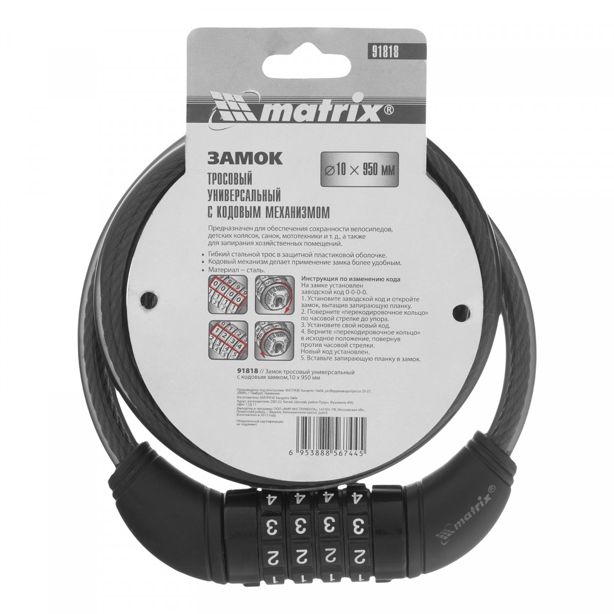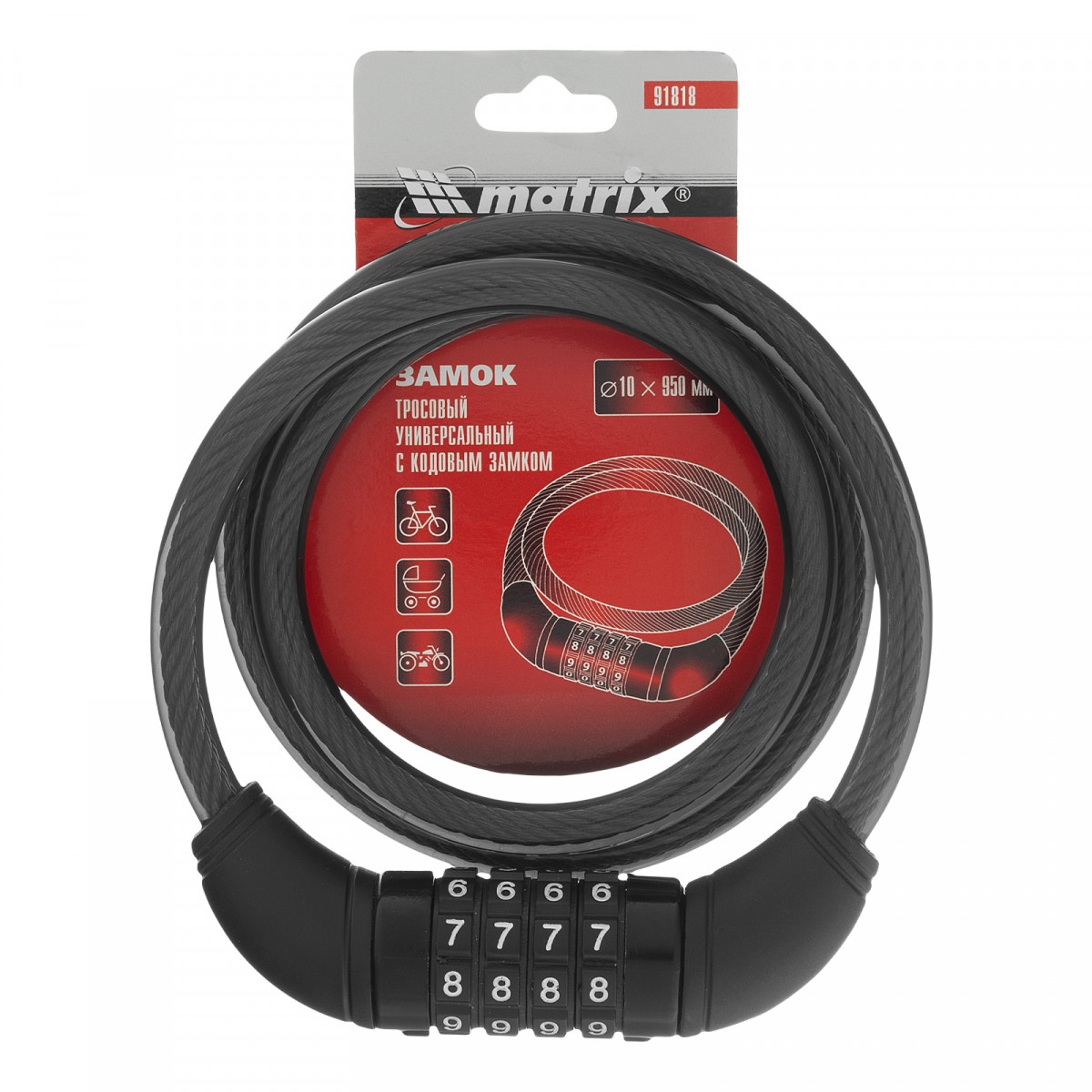 Замок тросовый универсальный с кодовым механизмом, 10 х 950 мм Matrix