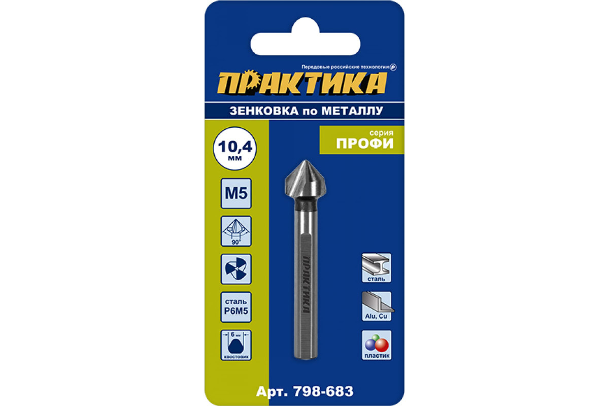 Зенковка по металлу 10.4x50 мм, 90 град., под резьбу М5 ПРАКТИКА 798-683 предназначена для снятия фаски по краю отверстия или формирования конического углубления под потайные головки крепежных элементов в стали с пределом прочности до 900 Н/мм2, сером чугуне, цветных металлах и твердом пластике. Изготовлена из быстрорежущей стали Р6М5 с поверхностным упрочнением режущей кромки.