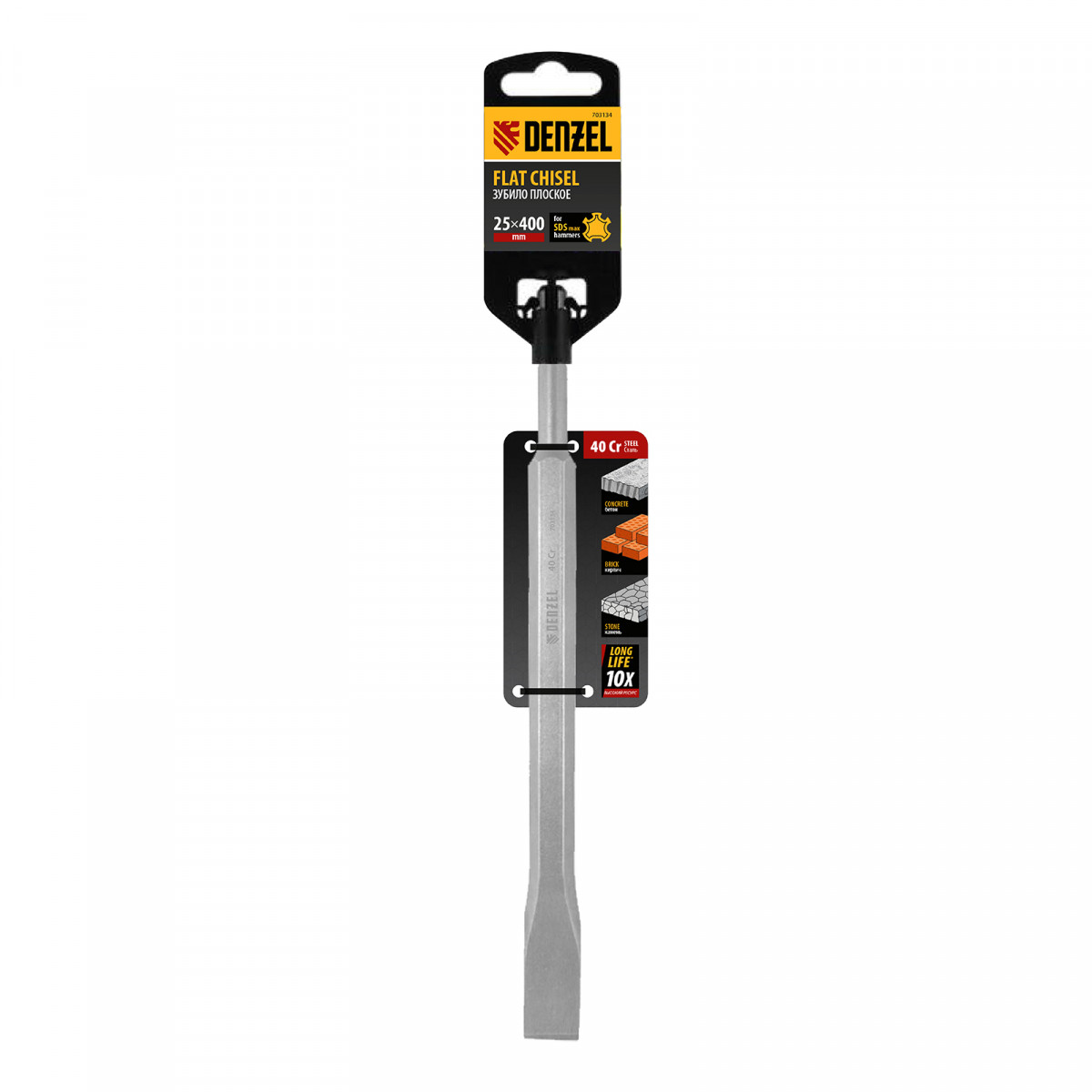 Плоское зубило Denzel 703134 размером 18 x 25 x 400 мм, из стали 40Cr, с хвостовиком SDS-max — оснастка для мощных, тяжелых перфораторов. Предназначено для эффективного выполнения ударных, демонтажных работ с твердыми материалами, такими как камень, бетон, кирпич. Пригодится на строительной площадке.
